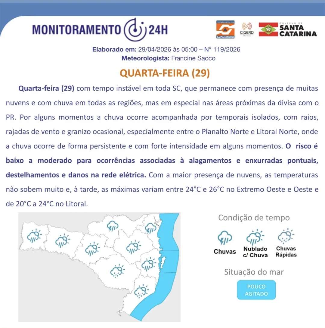 Nesta quarta-feira (29), a previsão para o município é de tempo instável com presença de muitas nuvens. Há risco moderado para ocorrências associadas a temporais isolados, que podem vir acompanhados de raios, rajadas de vento e queda de granizo. A Defesa Civil alerta para a possibilidade de alagamentos pontuais e danos na rede elétrica da cidade. As temperaturas máximas na região devem variar entre 24°C e 26°C.