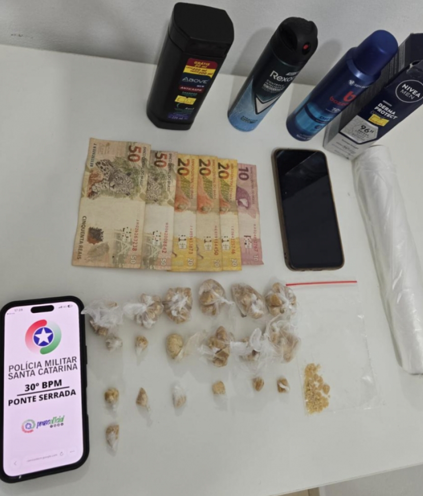 No local, o homem tentou fugir e ofereceu resistência à abordagem policial. Durante a ação, foram recuperados os produtos furtados, sendo um shampoo, dois desodorantes e uma espuma de barbear. Além disso, os policiais apreenderam cerca de 84 gramas de substância análoga a crack, dinheiro e materiais utilizados para o fracionamento da droga.