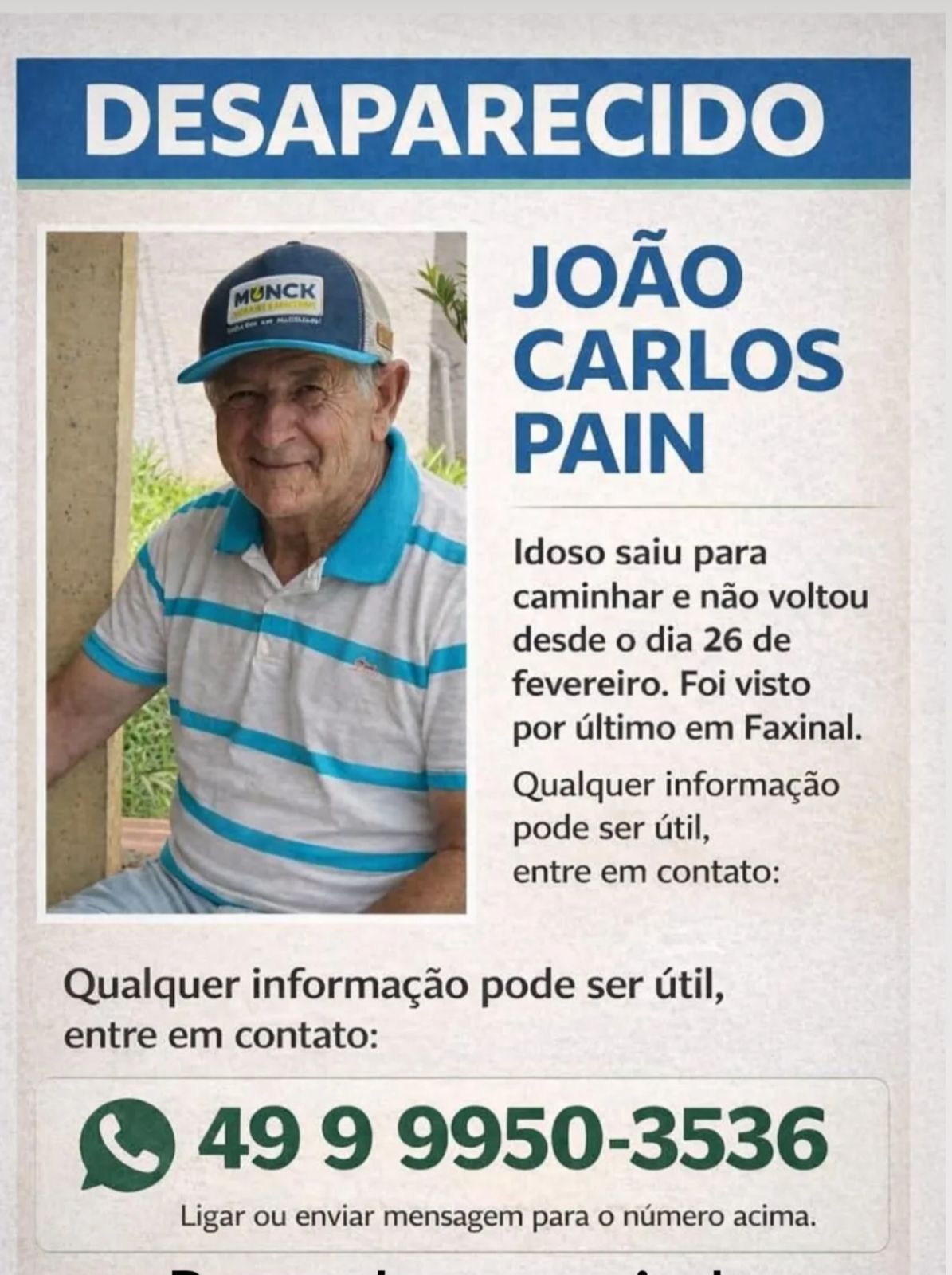 De acordo com o relatório, no dia 27 de fevereiro, a guarnição recebeu a informação de que o senhor João Carlos Pain, idoso diagnosticado com Alzheimer, estava desaparecido. Segundo familiares, ele havia saído caminhando de Xanxerê em direção a Faxinal dos Guedes, sendo visto pela última vez nas proximidades do posto de combustível Russi, no primeiro trevo de acesso ao município.