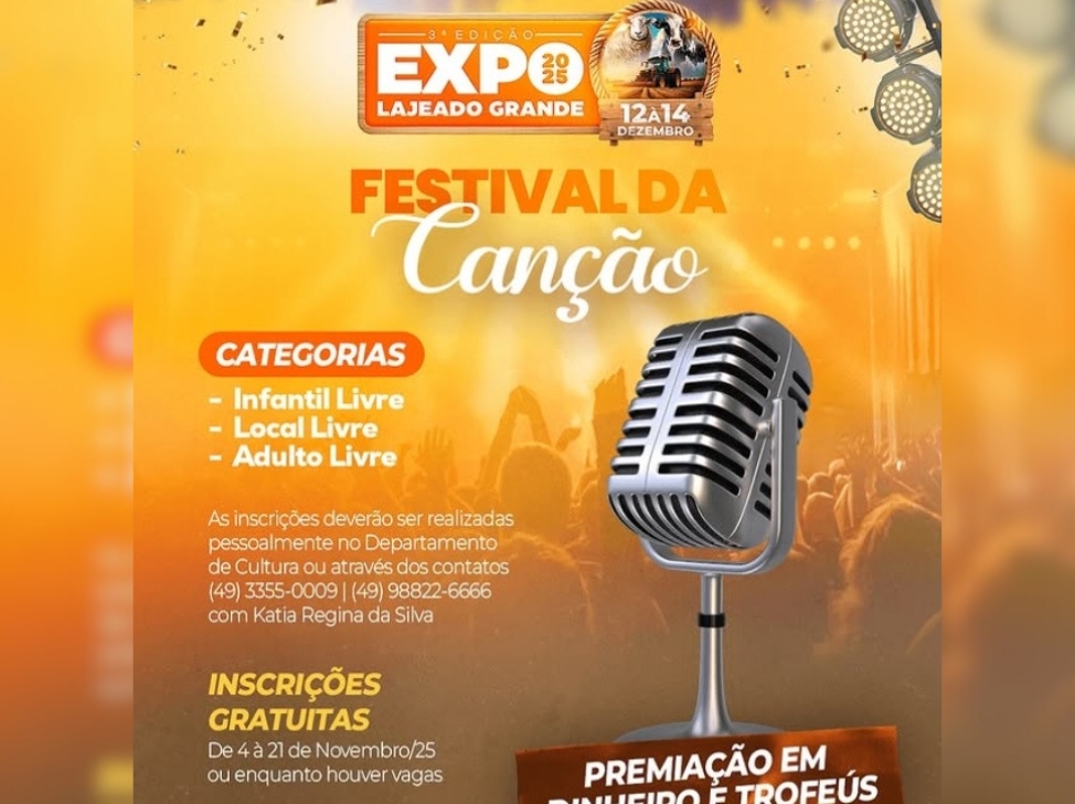 A Administração Municipal de Lajeado Grande, por meio do Departamento de Cultura, anunciou a realização do 3º Festival da Canção, que acontecerá no dia 12 de dezembro, na Arena de Palestras e Shows da Expo Lajeado Grande 2025. O evento busca incentivar e valorizar talentos musicais locais e regionais, promovendo o intercâmbio cultural e oferecendo um espaço para intérpretes de diferentes idades mostrarem suas habilidades vocais.