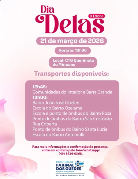 A valorização e o fortalecimento do protagonismo feminino estarão em destaque em Faxinal dos Guedes com a realização do evento “O Dia Delas – II Edição”. A programação acontece no próximo dia 21 de março de 2026, a partir das 13h30, no CTG Querência do Minuano.
