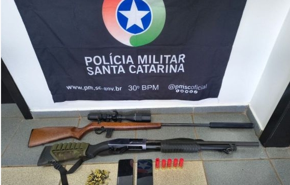 Em buscas na residência, a guarnição localizou e apreendeu uma espingarda calibre 12 com munições, um rifle calibre .22 com diversas munições e acessório tipo silenciador, além de aparelhos celulares.